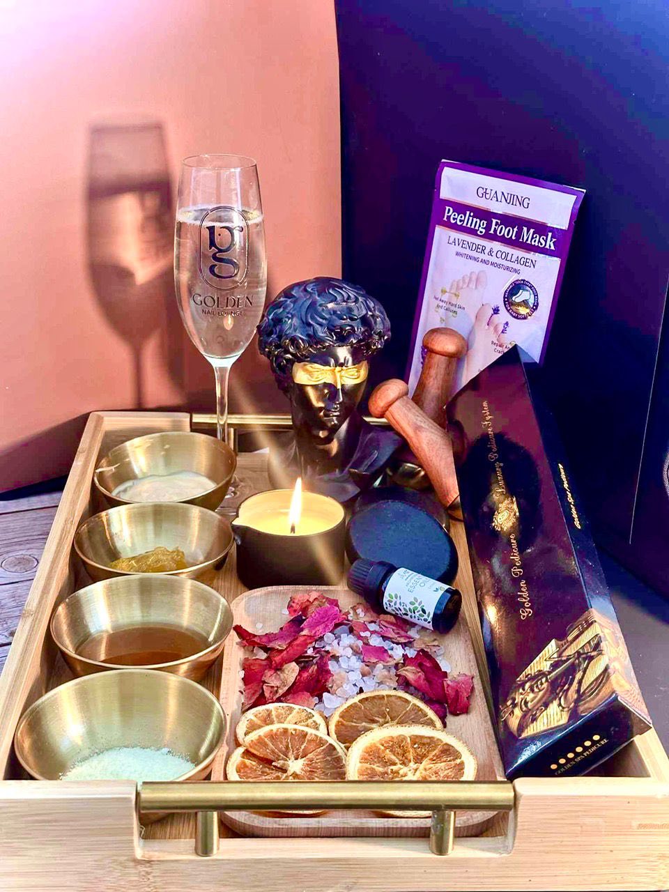 30-minute massage, 1 FREE Drink (Water / Soft Drinks / Mocktails / Cocktails / Wine) - Our most luxurious pedicure with pure 24k gold powder and sea salt foot soak, golden sugar scrub, radiant gold mask, special gel masks and golden hot stones, custom gold and collagen foot mask, exclusive 24k gold hot stones, jelly cream, and signature rose gold mask.Cash: $105.00Card: $107.10Gel Cash: $120.00Gel Card: $122.40 -