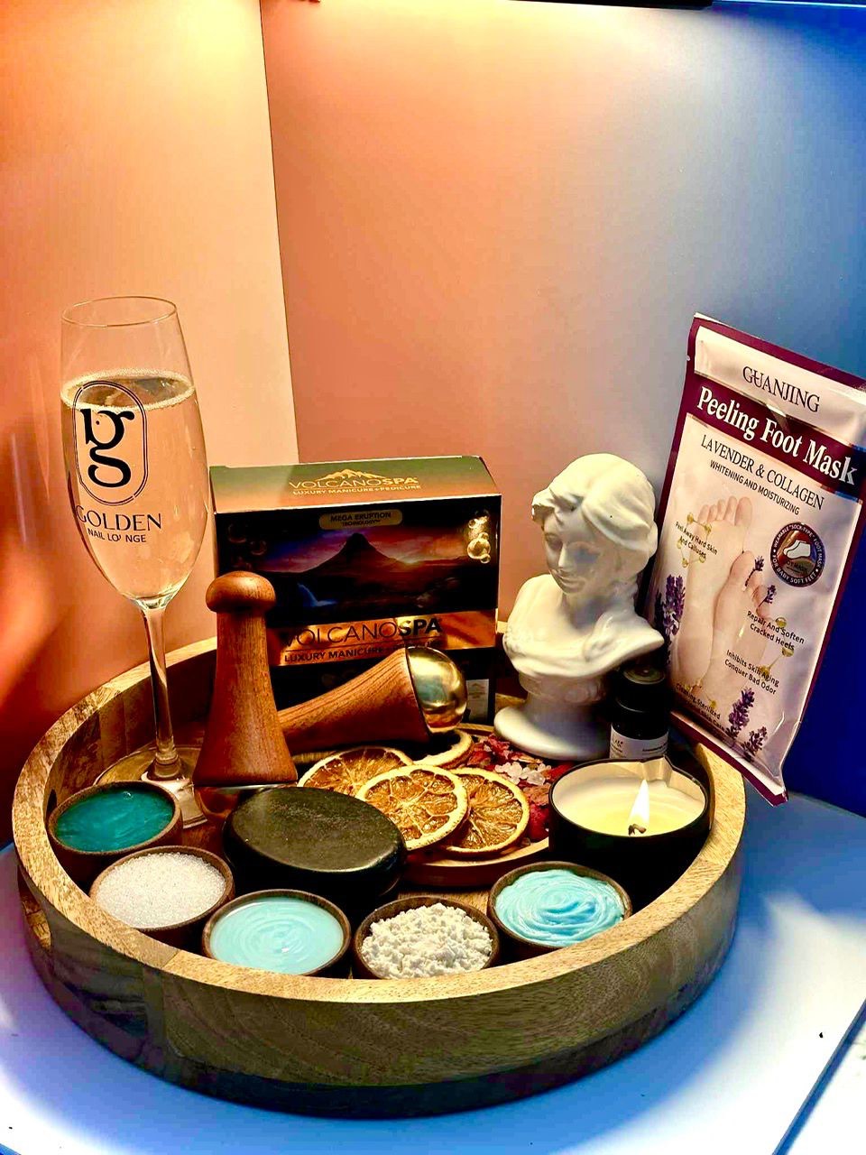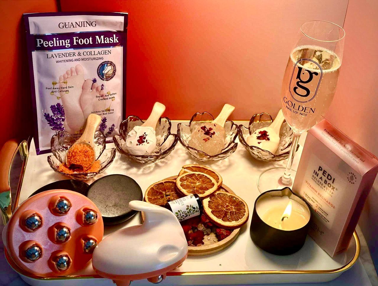 30-minute massage, 1 FREE Drink (Water / Soft Drinks / Mocktails / Cocktails / Wine) - Our most luxurious pedicure with pure 24k gold powder and sea salt foot soak, golden sugar scrub, radiant gold mask, special gel masks and golden hot stones, custom gold and collagen foot mask, exclusive 24k gold hot stones, jelly cream, and signature rose gold mask.Cash: $105.00Card: $107.10Gel Cash: $120.00Gel Card: $122.40 -